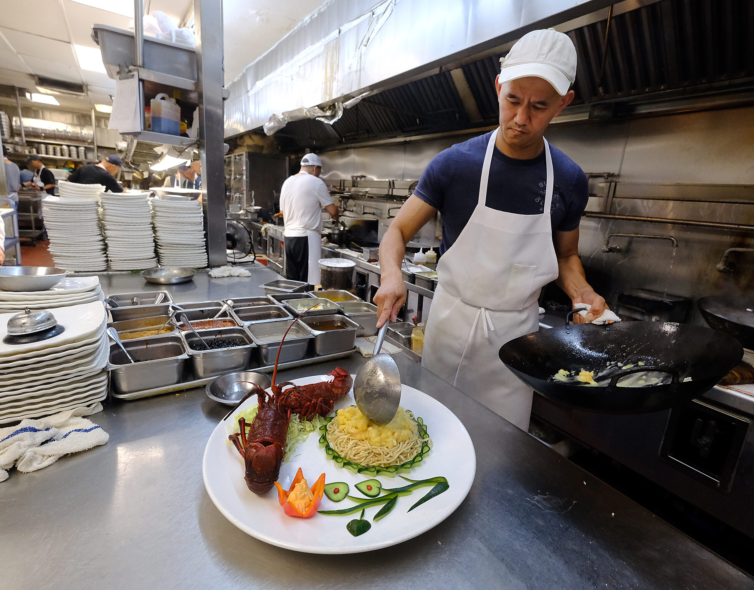 大厨Bin Kuang制作招牌菜芝士上汤龙虾意面 Photo by Michael Nelson