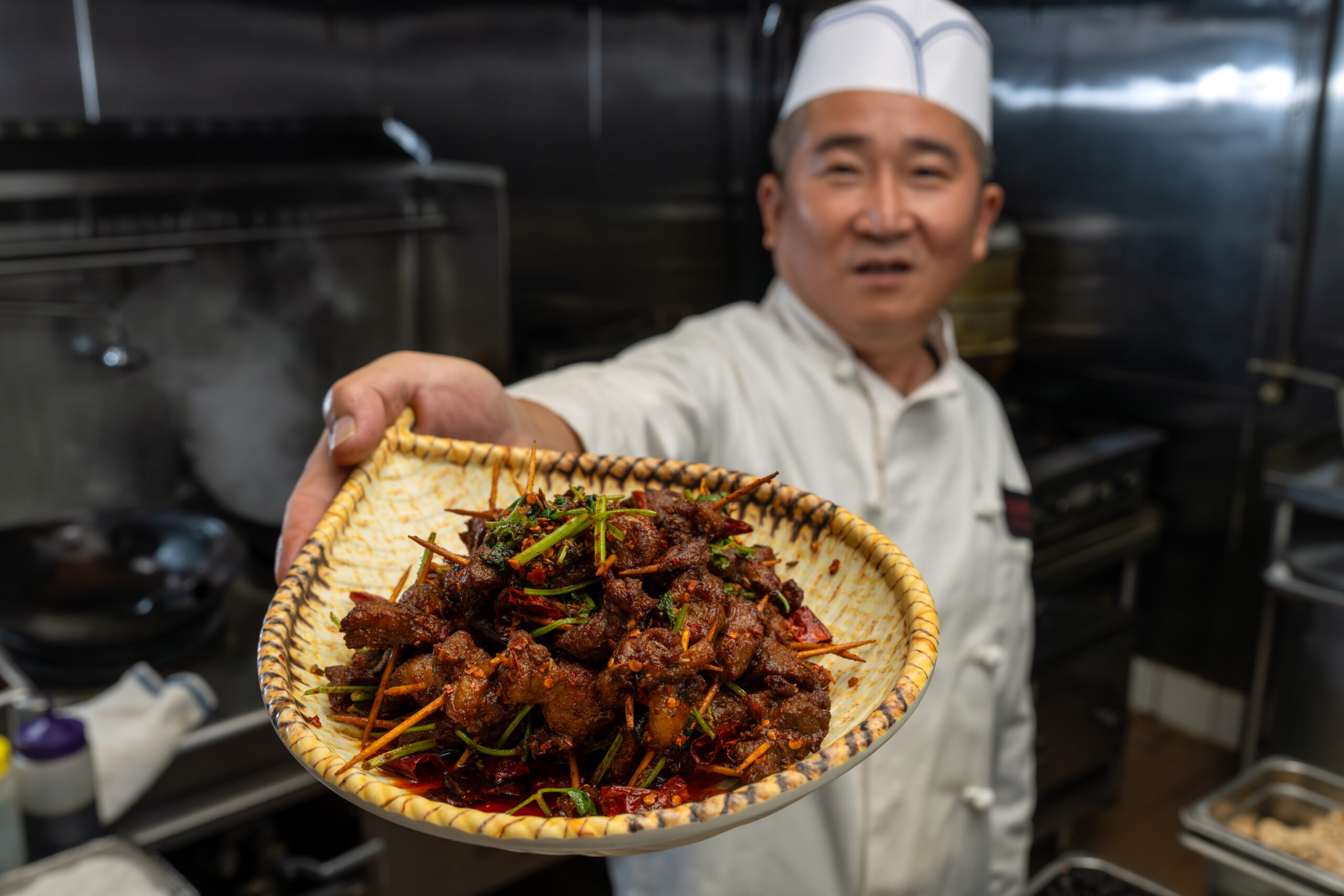 杨大厨展示特色牙签羊肉 Photo by Irfan Khan