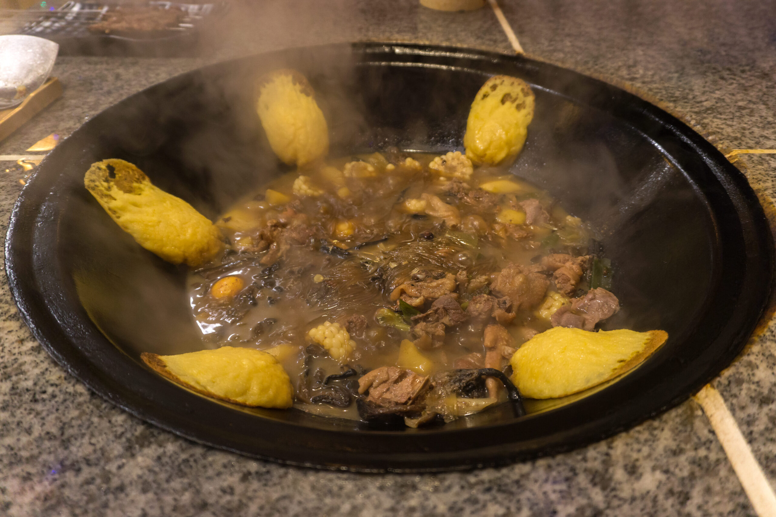 铁锅炖大鹅是东北经典名菜。鹅肉炖上几小时至酥烂脱骨,鹅油渗进汤里,土豆绵软,酸菜解腻。几人围锅边炖边聊,汤越炖越浓,话匣子也越聊越开。