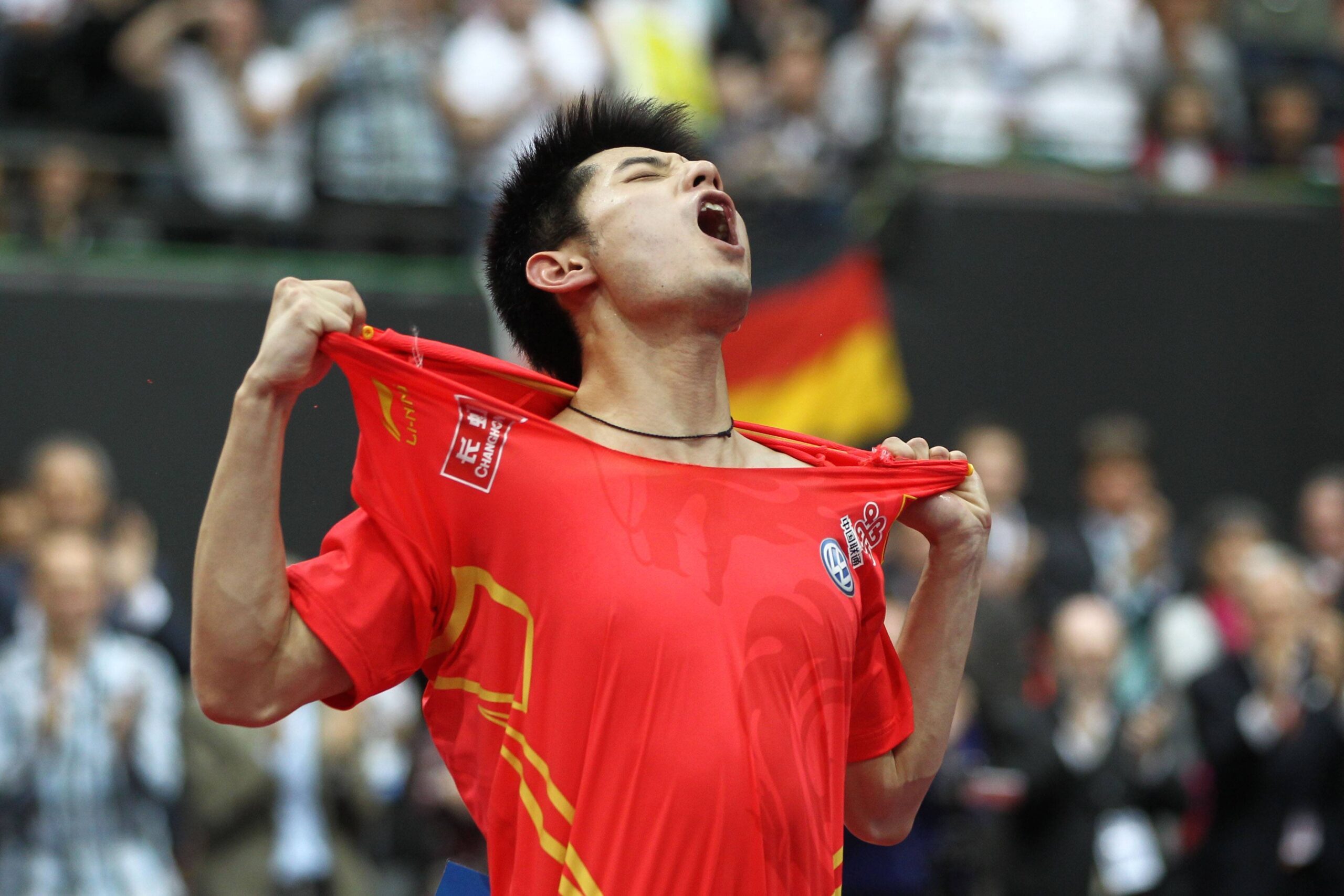 张继科在鹿特丹世乒赛上“撕衣怒吼”(图/视觉中国)