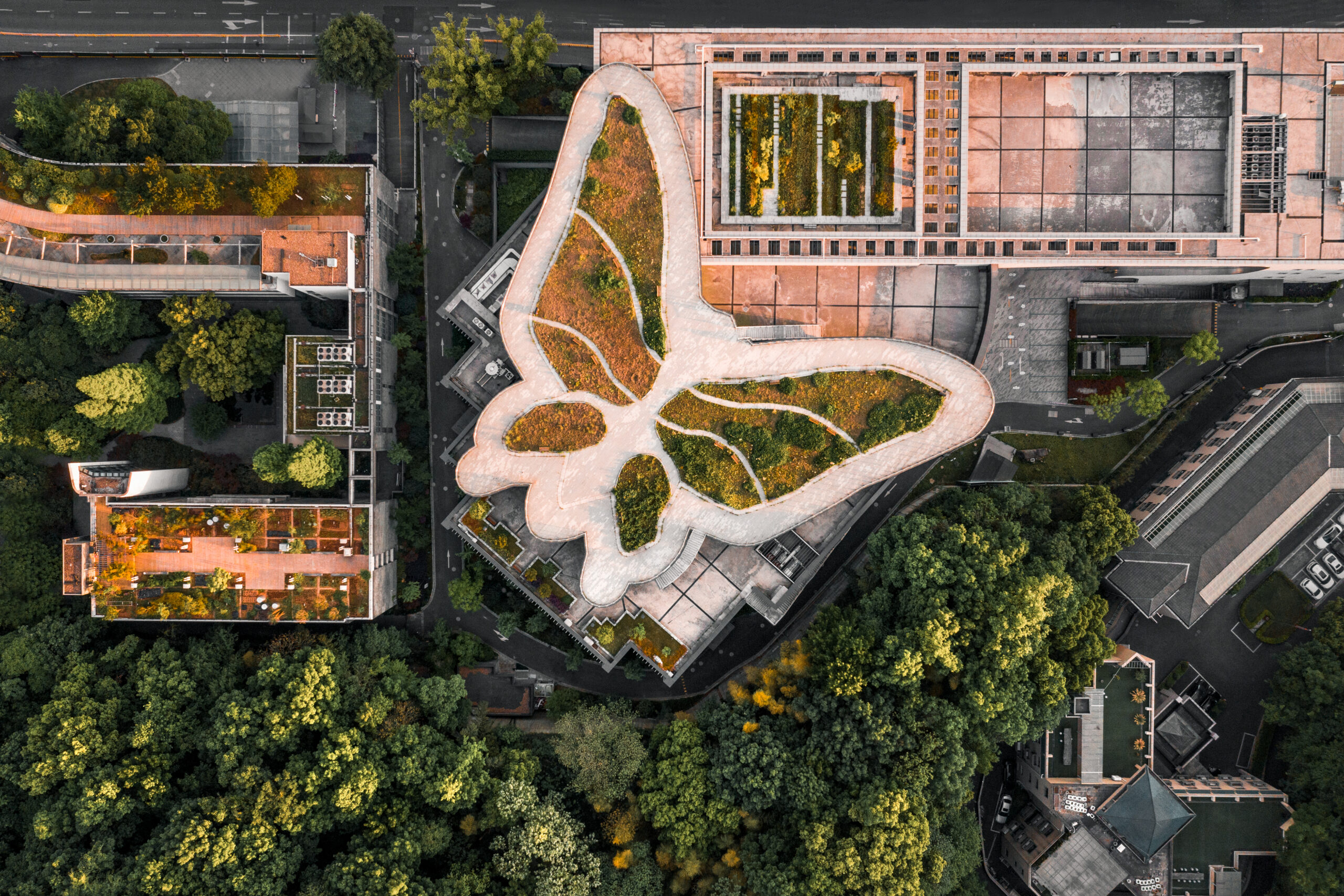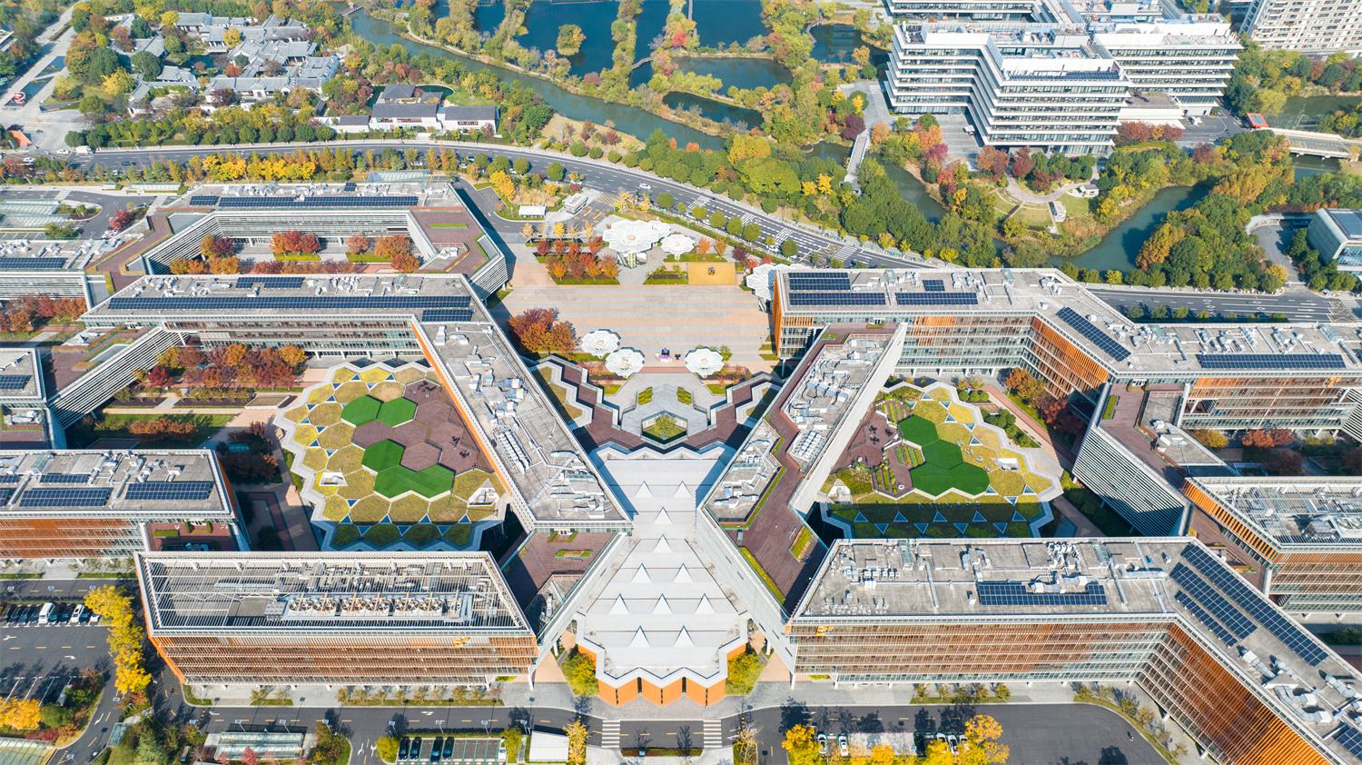 园区满目绿意与科技感交织。绿色低碳的理念贯穿设计:屋顶太阳能电池板提供40%用电,海绵城市设计回收雨水用于灌溉,花园与办公区相融,打造出科技与自然共生的环境。