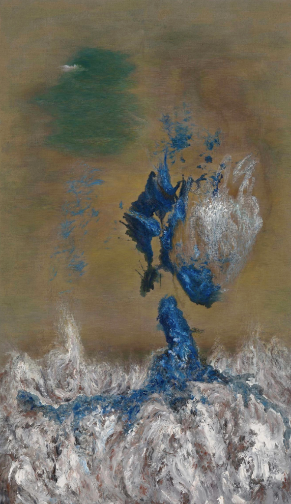 而他的《元素》系列,更是把东西方美学揉得恰到好处。他以北宋山水画为骨,带上西方抽象表现主义的色彩张力,蓝绿的冷色调铺出“水”的意象,为人们带来了心灵的安抚与慰藉。