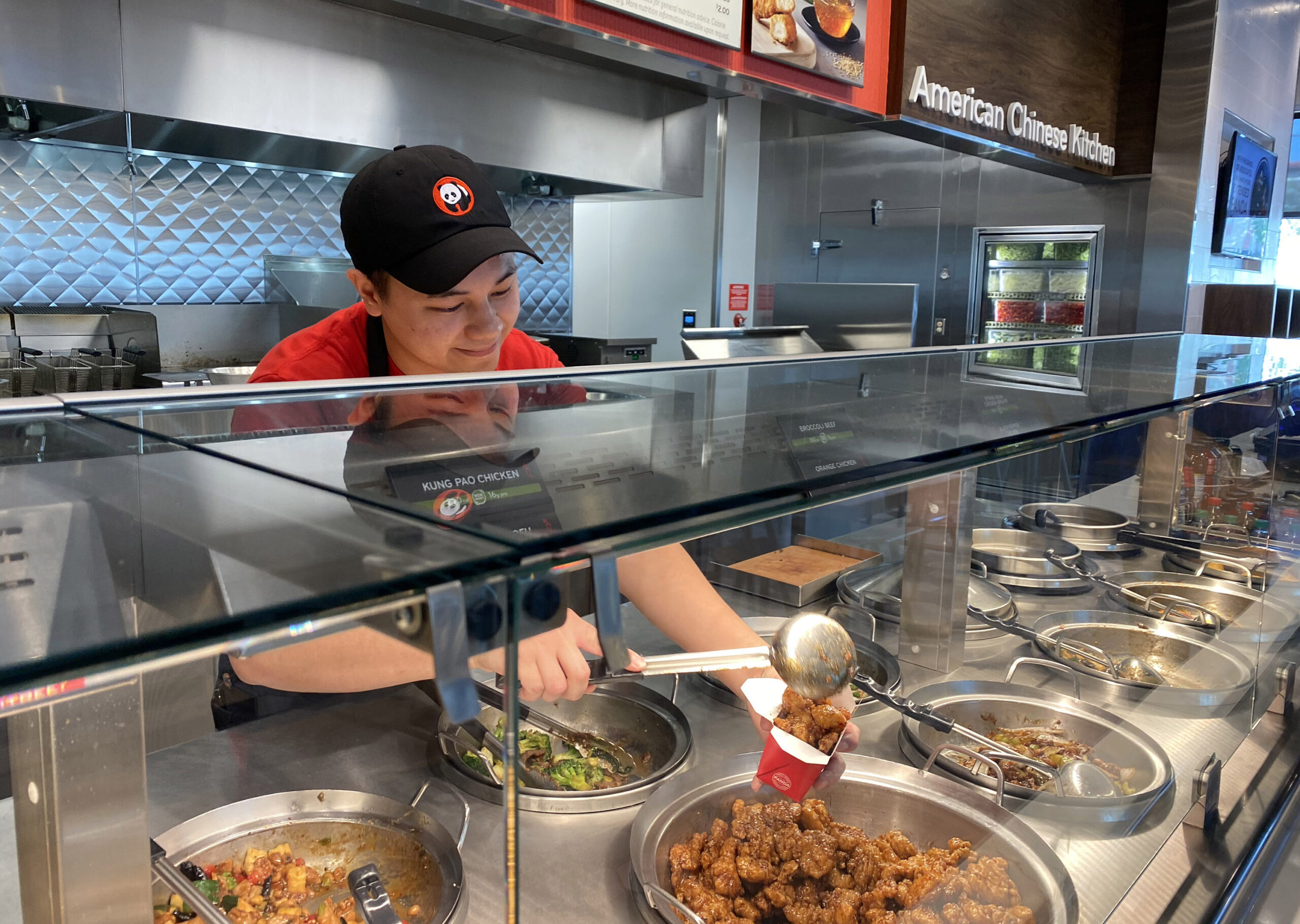 熊猫快餐店员正在往快餐盒里盛放陈皮鸡(Orange Chicken)。图/Newscom