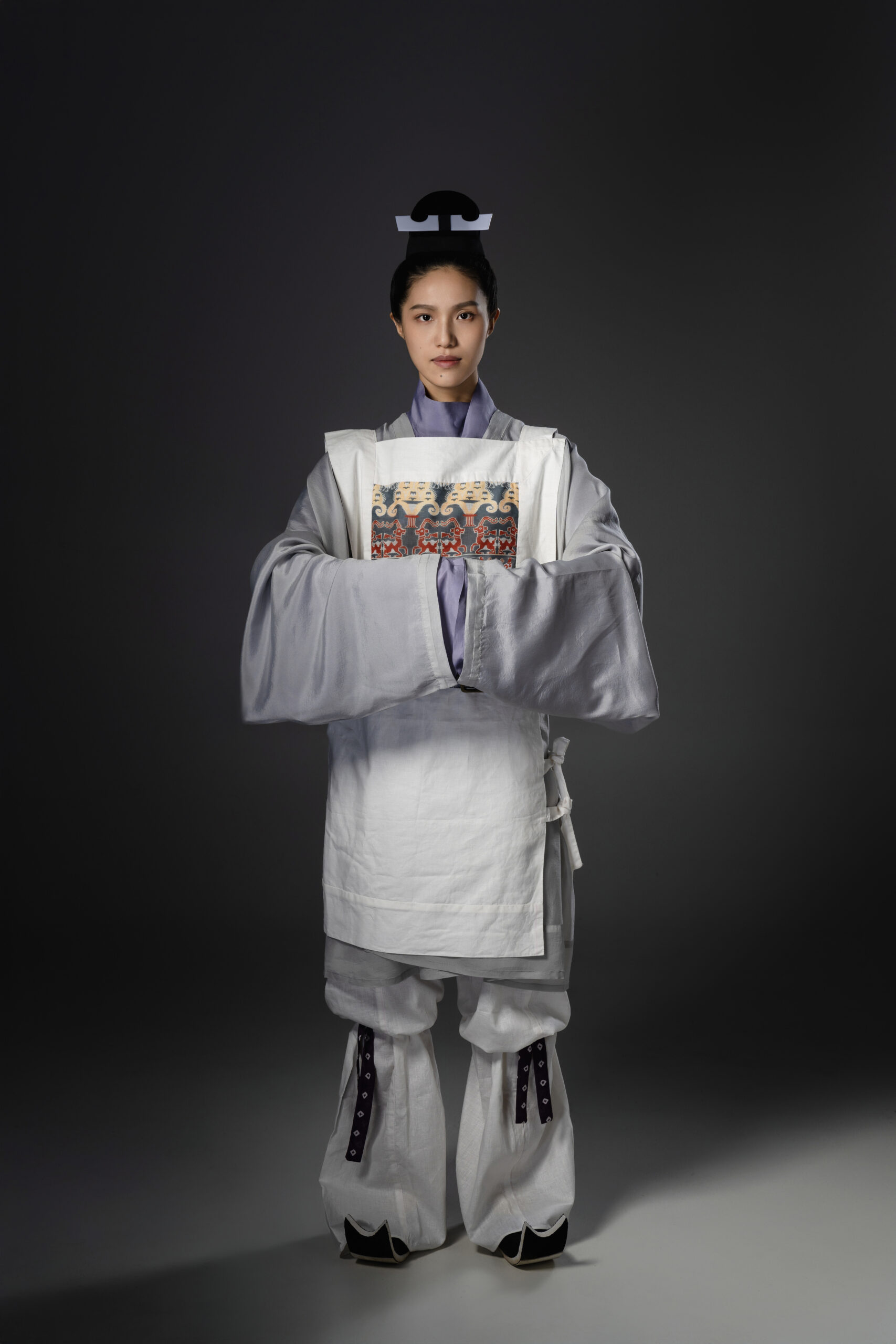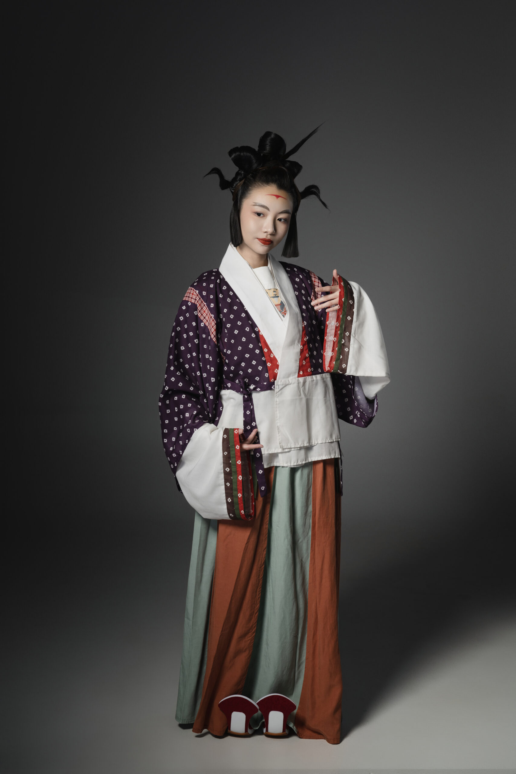 模特内穿袴褶,即“上服褶而下缚袴”。大褶为当时常见之上衣,袖宽多变。模特所穿小袖褶衣,参考了北朝一件出土的大褶文物,衣襟左右对称,共系五带,既可交叠前襟作交领穿着,亦可作对襟(或直领)穿着,其灵活多变的穿法,恰如其分地体现了鲜卑族半胡半汉的民族特性。袴则为叠裆阔腿裤,穿着者常在膝盖以下、小腿以上的部位用布带扎紧,以便行动。