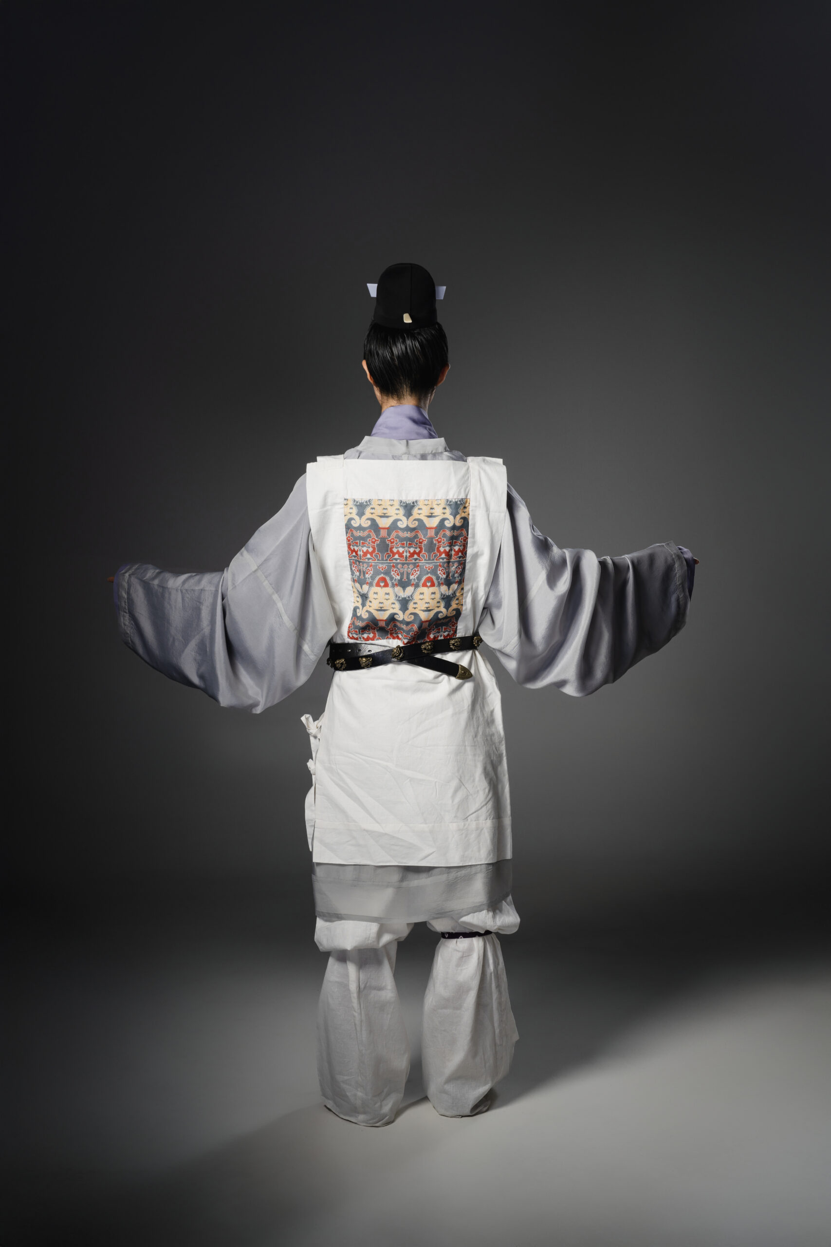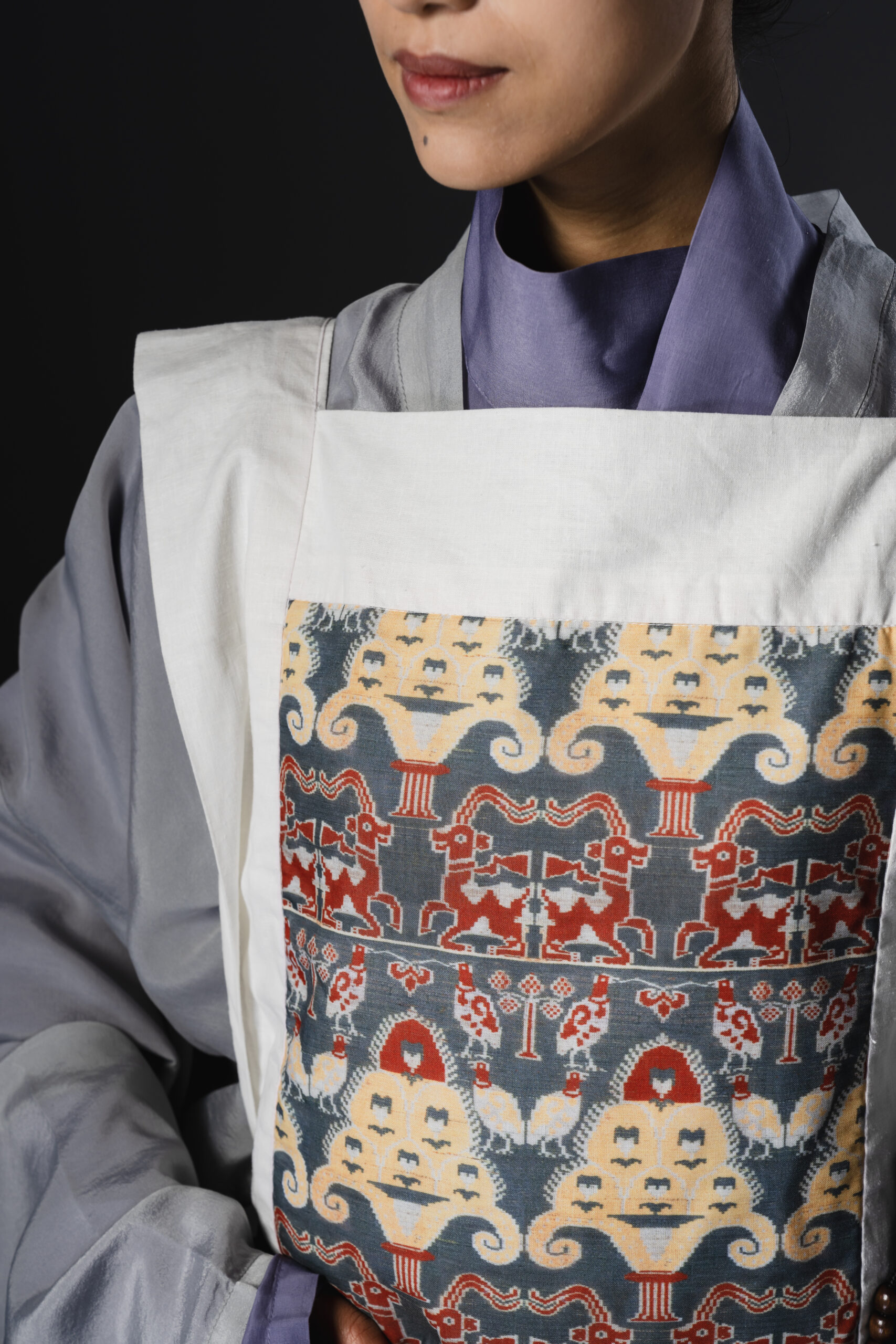 此次复原的北魏士人造型,参考自河北省北朝考古博物馆所藏的军士俑。模特的最外层衣物为裲裆,此服饰最早见于东汉《释名·释衣服》的记载。裲裆由前后两片组成,一片护胸,一片护背,肩部以革带或布带相连,其形制颇似今日之背心,最初乃是内衣之选。至西晋,裲裆外穿渐成风尚,裲裆衫应运而生。北魏孝文帝迁都洛阳后,裲裆更是成为正式着装的一部分,常以腰带束于腰间。模特所着裲裆,其胸背图案灵感源自新疆出土的对鸟对羊灯树纹锦。裲裆外穿相传是宫中女子开创的时尚,而北魏男性完全接纳了这种流行,北朝陶俑中不乏身着裲裆的文武朝臣形象。