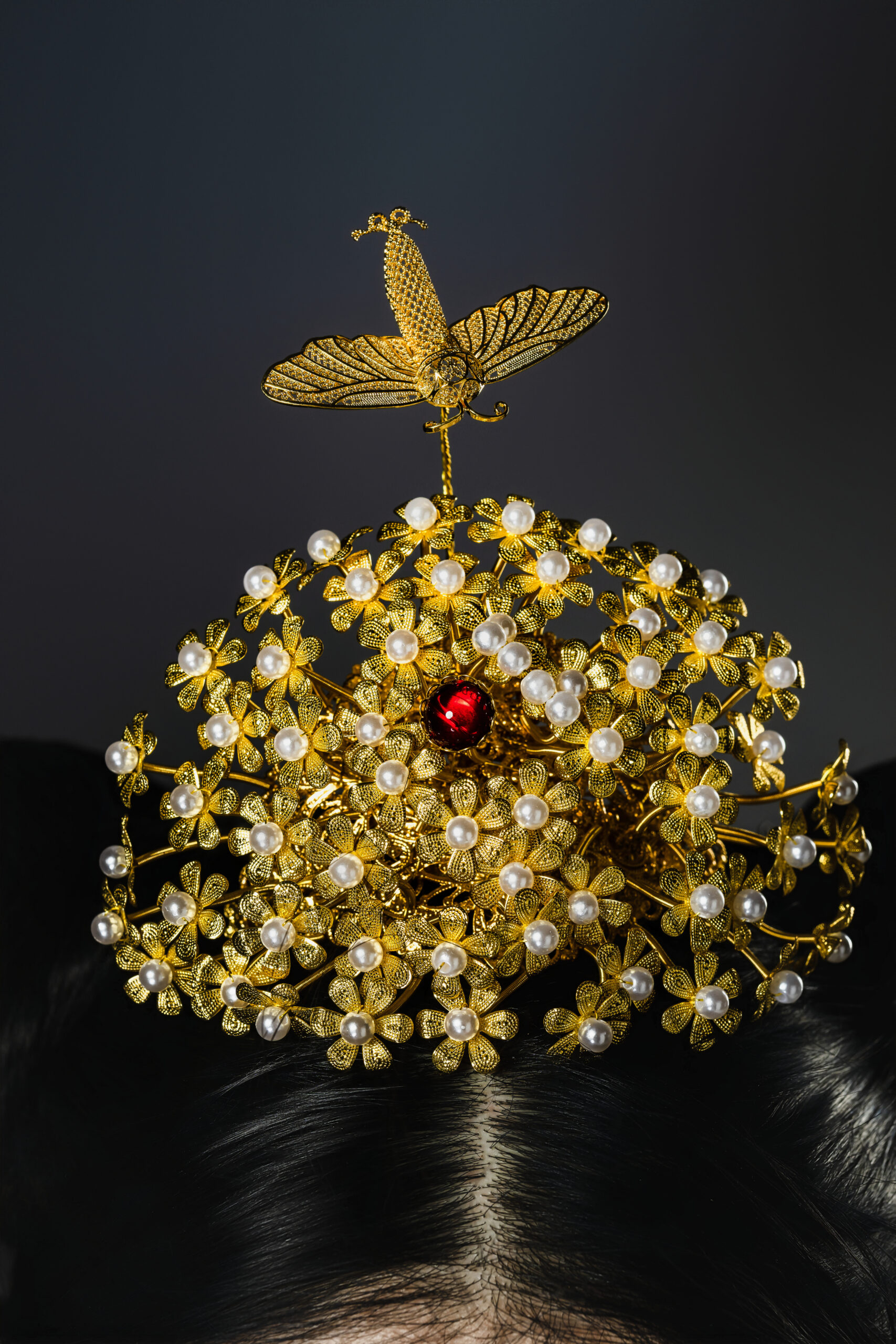 模特头梳双环髻,佩戴的首饰参考了隋代墓葬的出土文物。模特发冠上的花树(也称步摇),其数量对应了贵族妇女的不同等级。由28个金质球形链珠串成的项链,每个金球里面都镶嵌着粒粒润圆的珍珠,搭扣上圆形金饰,内嵌一块雕刻着大角鹿图案的蓝色青金石。这种凹雕工艺和金珠上独特的联珠纹饰均源自古代波斯萨珊王朝,具有浓郁的西亚艺术风格,是东西方文明交流的珍贵物证。