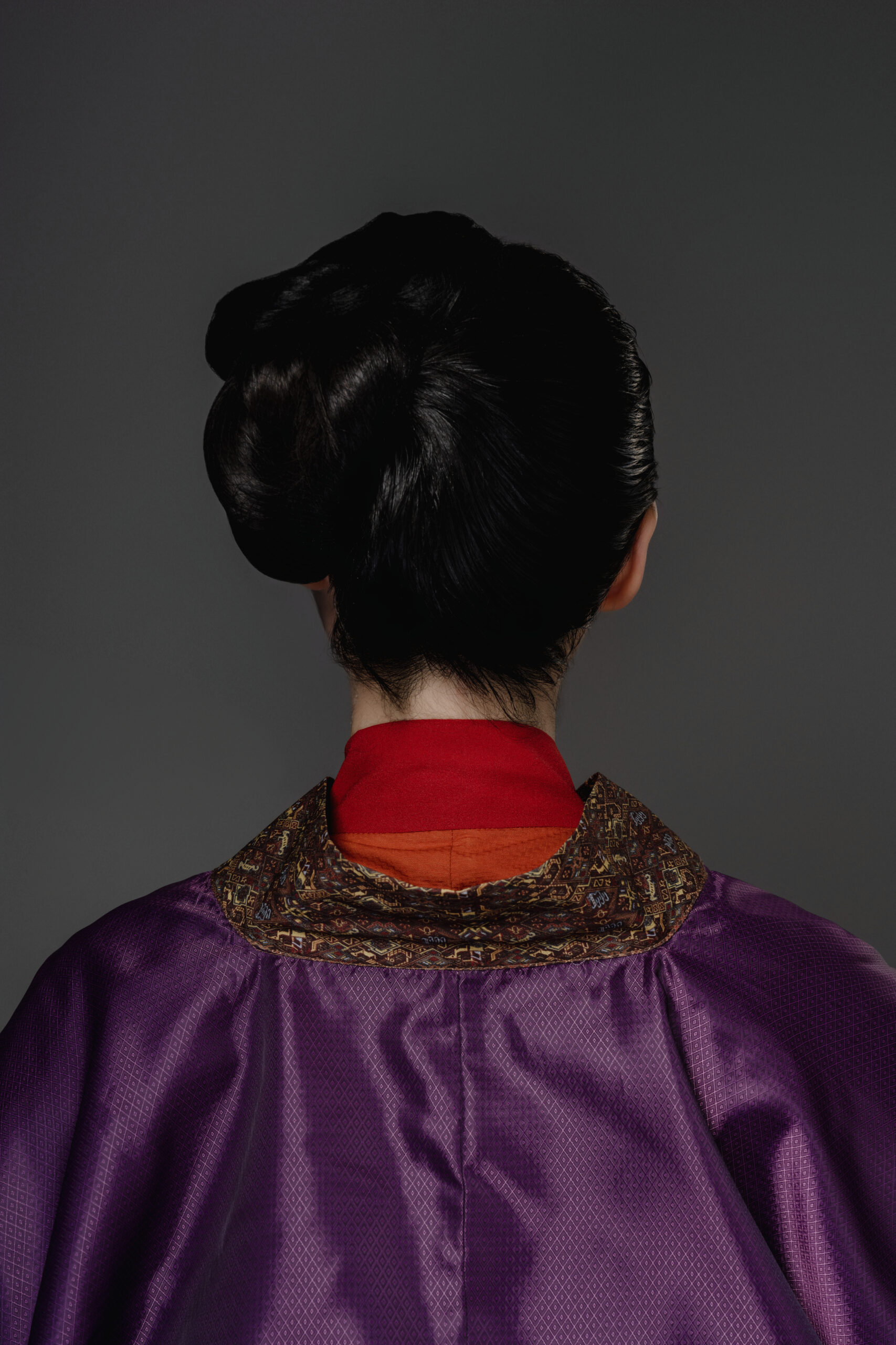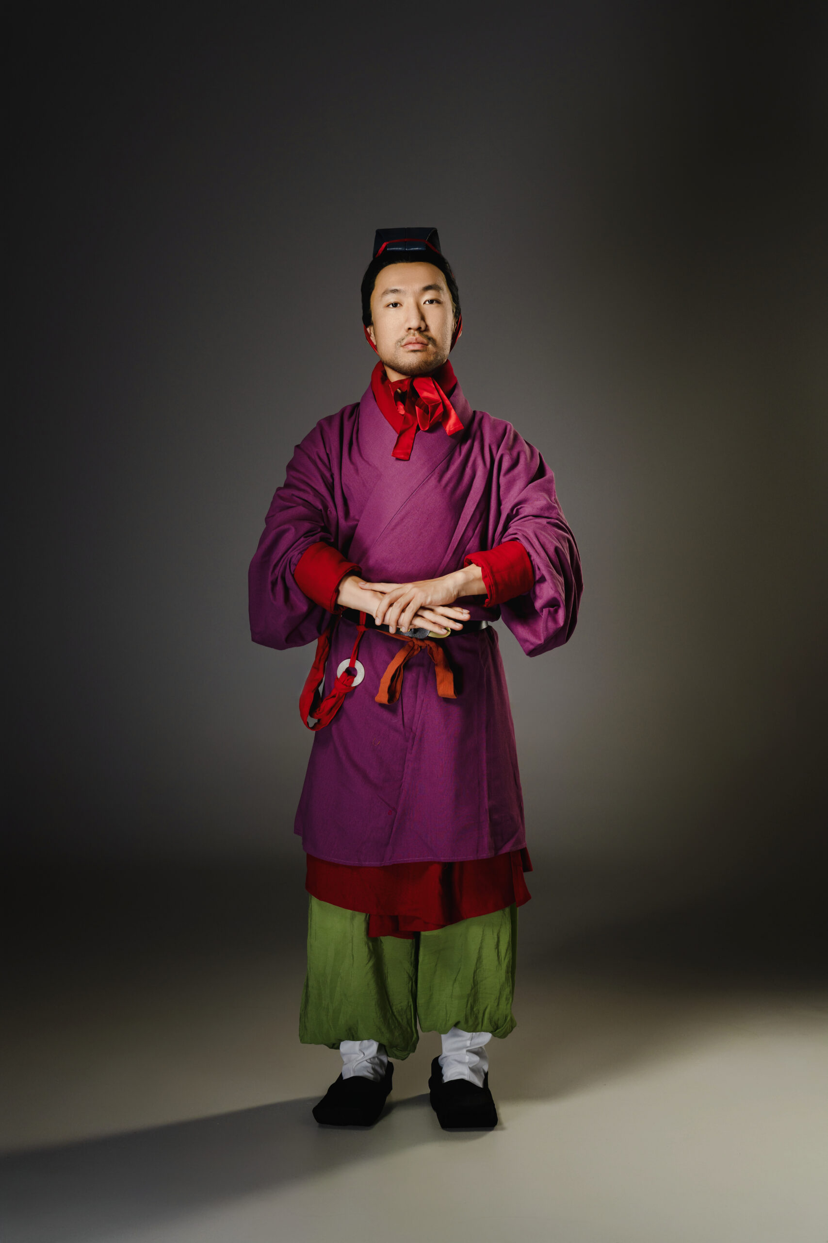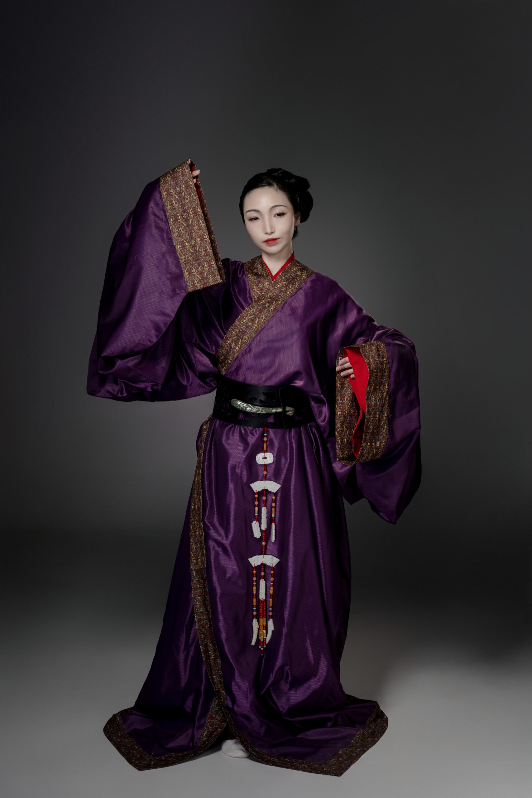 模特内层穿着燕尾宽领中衣,作为贴身穿着。其外披深衣形制的紫色戎服,交叠穿着后,两侧衣摆自然形成类似“燕尾”的两个尖角,使衣摆下缘呈内凹状。