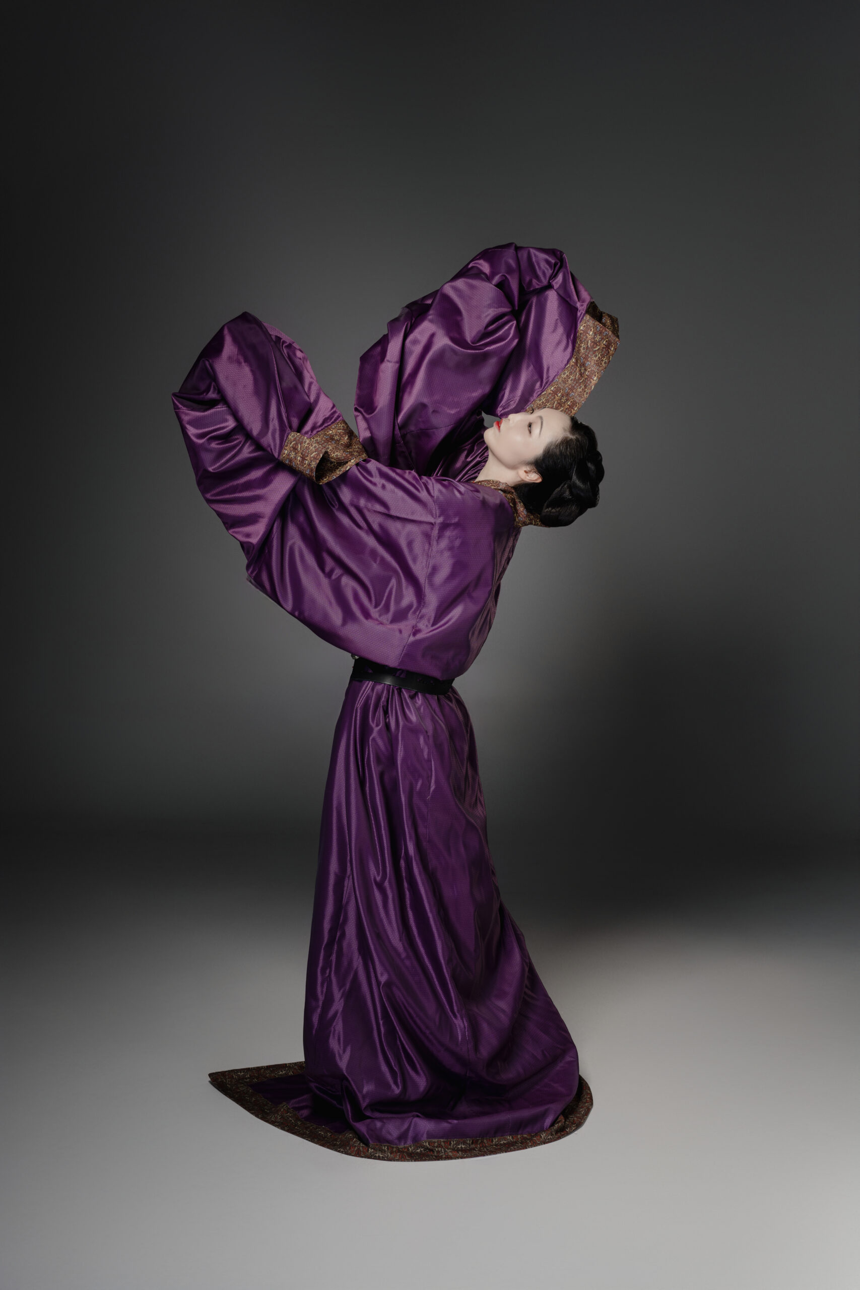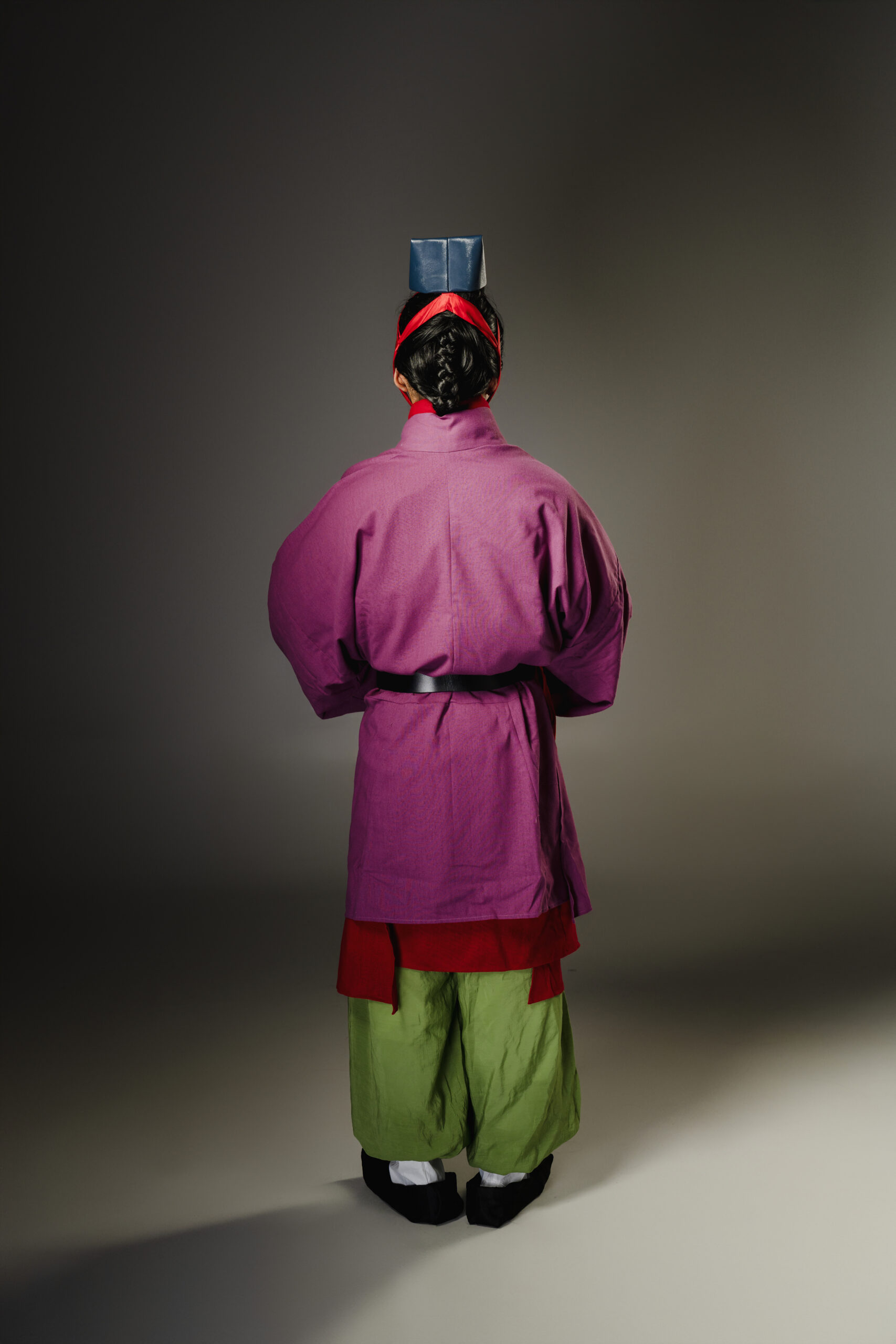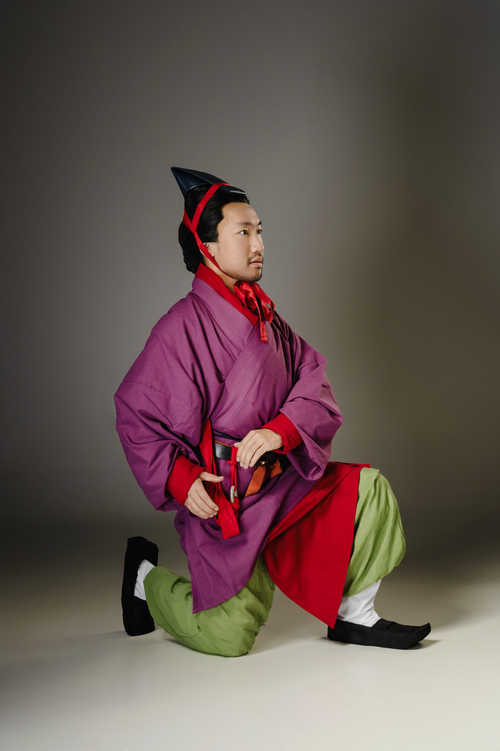 模特内层穿着燕尾宽领中衣,作为贴身穿着。其外披深衣形制的紫色戎服,交叠穿着后,两侧衣摆自然形成类似“燕尾”的两个尖角,使衣摆下缘呈内凹状。