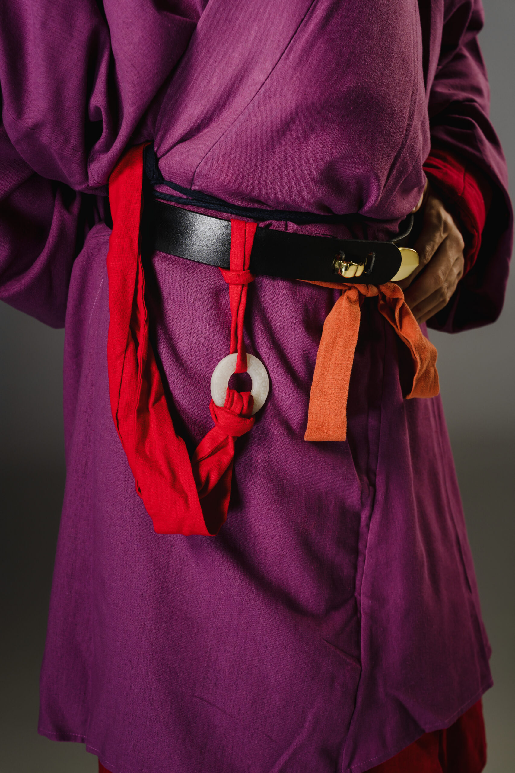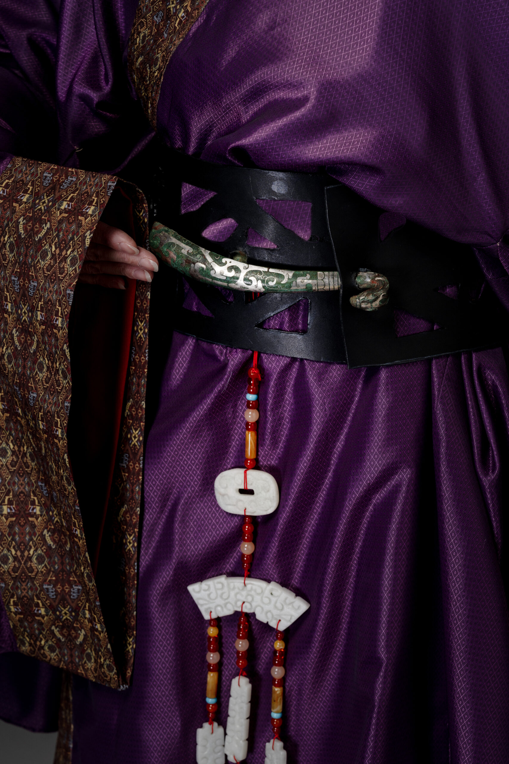 秦人重视腰带的装饰,佩绶的使用亦与官职等级相关。模特腰间的皮带,用马头带钩固定,制作精良,既具实用性,又体现佩戴者的身份。腰带上系着的带有玉环的红色绶带,代表了穿着者的官爵地位。