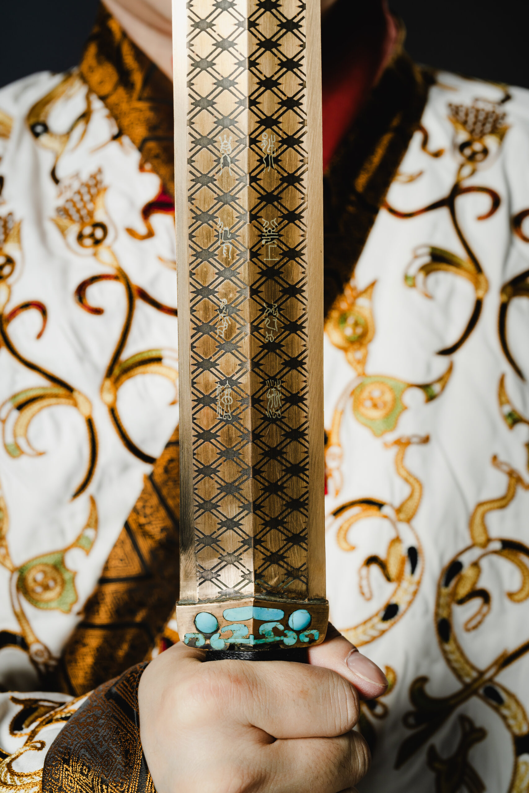 模特所穿龙凤虎纹绣罗单衣,是根据战国晚期湖北省江陵马山楚墓所出编号N9的罗衣复原。该墓主包裹各类衿衾衣袍共十三重,N9居第六重。衣长192厘米,袖展276厘米,袖宽50.5厘米,腰宽65厘米,放量恢廓。主体面料为灰白色四经绞素罗绣地,绣纹以龙、凤、虎相搏为式,一侧是展翅凤鸟,头顶花冠,脚踩小虬,另一侧是猛虎奔逐大龙,大龙作抵御状。楚地纹章多有凤驭龙虎样,如九连墩二号楚墓出土的虎座凤架鼓,或据此以为楚人崇凤。