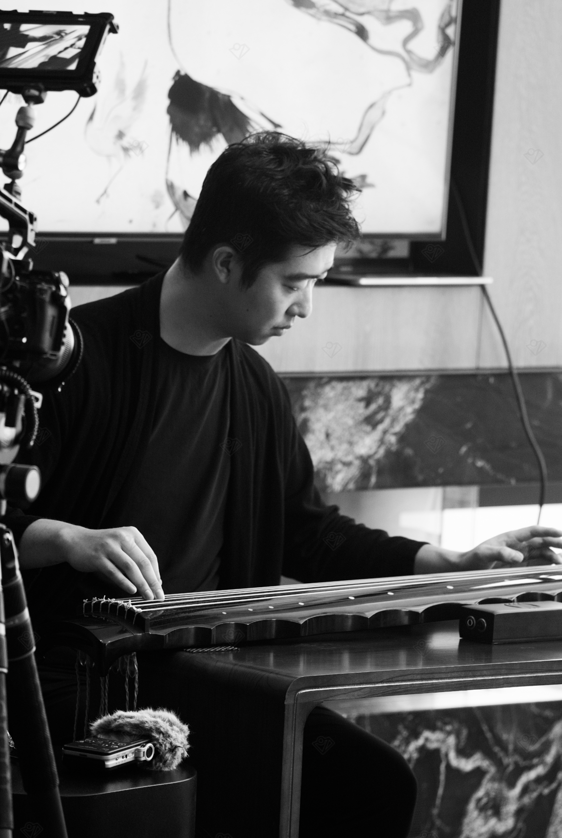 古琴音量小、低调内敛,在嘈杂的环境中几乎听不清,这一特性决定了它并非为舞台而生,而是弹给自己听的乐器,是人与自身的对话。马玢弹古琴,不追求炫技,似重在意境与“弦外之音”,在意音与音之间的“空白”。这种虚实相生的美学意境,与水墨画的留白、诗词的含蓄一脉相承。